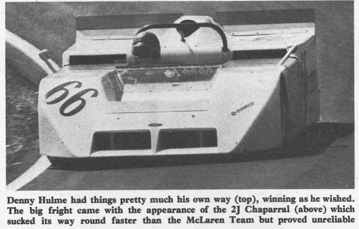 But perhaps the most momentous decision affecting the series ever made was taken at the end of November, when the Sports Car Club of America and the Canadian Automobile Sport Clubs announced that there would be no rule changes for the 1971 season. In doing this and, in effect, permitting the continued eligibility of cars like the 2J Chaparral, the decision made in November 1969 guaranteeing rule stability.