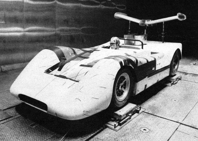 While the application of the wing concept to modern race car design is generally attributed to Jim Hall (Fritz von Opel used a wing on his 1928 rocket car), Lunn has gone a step further than Hall and put some dihedral (camber) in the G7-A's wings, in an effort to improve lateral stability as well as provide negative lift to the rear end. A fixed control strut supports the inner ends of both wings, while vertical struts to the center of each wing are attached-like the Chaparral's-to the suspension.