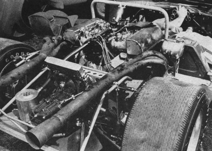 The transmission is a Hewland-like, dogclutch affair, driven through the same Falcon-based, 3-element torque convertor which has proved so successful in the Ford and Mercury drag-racing "funny" cars.