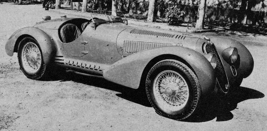 The obsolescence of the Tipo B had left Alfa-Romeo with a stock of some thirty unused engines and the company utilised these in a sports model known as the 8C2900B. For this very exciting road car, the engines were slightly detuned and were available in a chassis of 9 ft 2.5 in or 9 ft 10in wheelbase with aerodynamic 2-seater coachwork. Specification of the engine was as for the Grand Prix cars, with twin superchargers and Weber carburettors and chassis design was similar to that of the 6C2300. The 4-speed gearbox was in unit with the final drive and there was a twin plate clutch of very much in or out action. Price in the United Kingdom, dependent on the coachwork fitted, was some £3,000 and the maker's claimed speed was 115 mph. However it was a simple matter to restore the engine to full Grand Prix tune, when 130 mph was available. The car with which Biondetti and Stefani won the 1938 Mille Miglia was brought as a demonstrator to the London Motor Show that year. It was subsequently purchased by Hugh Hunter, who lapped Brooklands at 123 mph with it and it was later sold to Tony Crook. It is believed that six of these exotic cars were imported to this country, but all have now been sold in the USA.The 2300B model remained in production until the outbreak of war in 1940, but was joined in 1938 by the 2300C, which was available in long and short chassis forms, and as the "Mille Miglia" sports model had a top speed of close to 100 mph. A version with engine enlarged to 2,443 cc (72 x 100 mm), the series 6C2500 was also added to the range in 1938 in three forms, Turismo, Sport and Super Sport. By this time the pattern of modern styling had been set and the saloon versions were fitted with gracefully curved and aerodynamic coachwork, which was a little on the heavy side, but gave the company an established, and modern car, to reintroduce after the war.