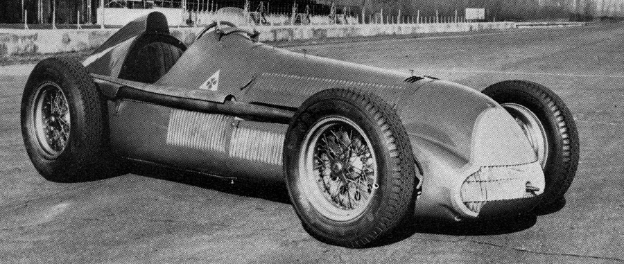 By 1951 the Tipo 159 was developing no less than 405 bhp at 10,500 rpm on the test bed, and it is believed that under race conditions around 390 bhp at 9,000 rpm could be sustained for short periods. A de Dion rear axle was introduced, which improved roadholding to a slight degree, although the swing axle suspension was still used in some races. Side fuel tanks, which increased the capacity to 75 gallons, were also tried, but when these were full the handling was affected. This was a desperate resort to combat refuelling problems, as the 159 was now consuming fuel at the rate of 1 t miles per gallon. At the end of the 1951 season, Alfa could still claim to be "Campione del Mondo," but only just, for they won four Grandes Epreuves out of seven entered, the Swiss, Spanish, Belgian and European (at Rheims) events, the other three, the British, Italian and German Grands Prix, being won by Ferrari. This was the great era of Italian drivers, Farina, Sanesi and Fagioli driving for Alfa, Ascari and Villoresi for Ferrari, while the former team also had Fangio and the latter, Gonzales. At this stage Alfa-Romeo decided to rest on their laurels and withdrew from Grand Prix racing. Indeed apart from the 3.5 litre six-cylinder Disco Volante sports-racing car, no Alfa has been built specifically for racing since that time.